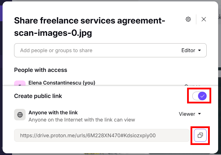 You can create a secure, public link directly from any image file or folder in Proton Drive that anyone can access. Choose to make the link view-only or set edit access to allow uploads, and optionally add a password or expiration date for extra control.