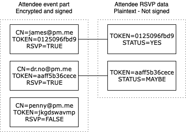 For each external attendee, Proton Calendar generates a unique random token (a string of 40 random characters). This token is encrypted and stored along with the attendee’s email and attendee role. The user’s token is also stored unencrypted and unsigned along with their RSVP status to allow external updates.