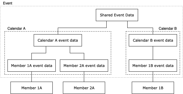 The diagram below represents a single event. Some properties are shared across the calendars to which the event is linked, others are calendar level, and finally, some are member level as described in the “Event splitting” section.