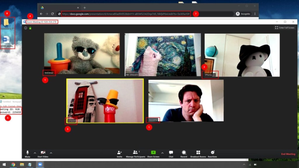 If you are talking to someone on a video conference or if you are sharing your screen, do not leave notes or documents with sensitive information (like passwords, URLs, or login credentials) visible. This security consultant pointed out(new window) how much information users inadvertently share on many video calls (and then broadcast further when they post screenshots of the call on social media).