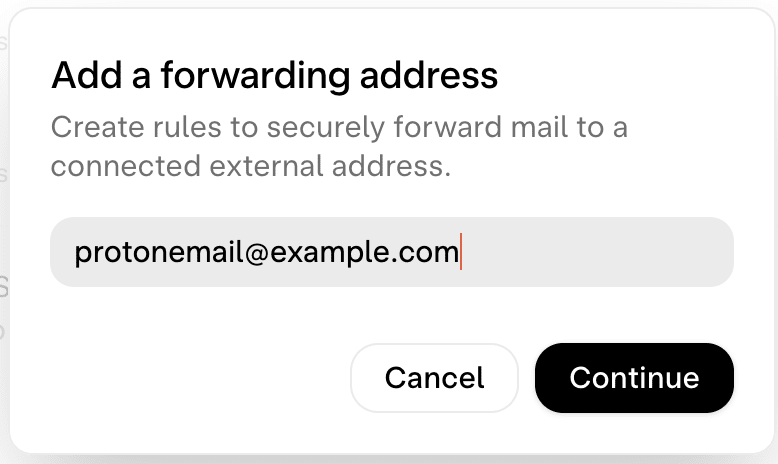 1. Ajoutez votre adresse e-mail Proton Mail et cliquez sur Continuer (« Continue » ci-dessous). L’exemple ci-dessous montre un domaine personnalisé. On vous explique plus loin comment obtenir un domaine personnalisé dans Proton Mail.