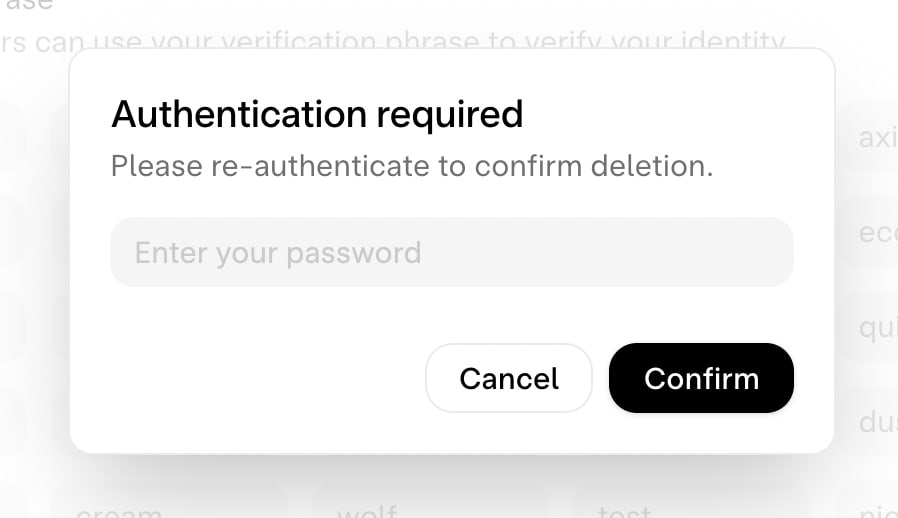 1. Il vous sera demandé de saisir à nouveau votre mot de passe Skiff. Cliquez ensuite sur Confirmer (« Confirm » ci-dessous).