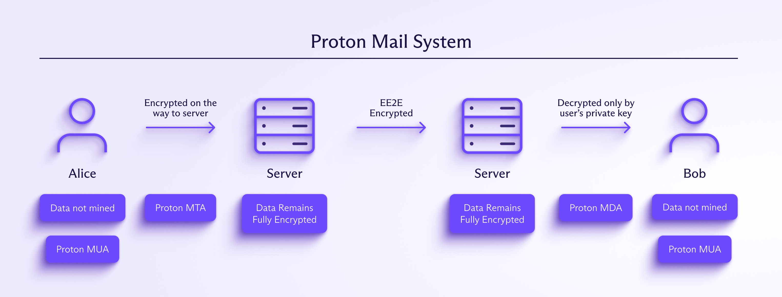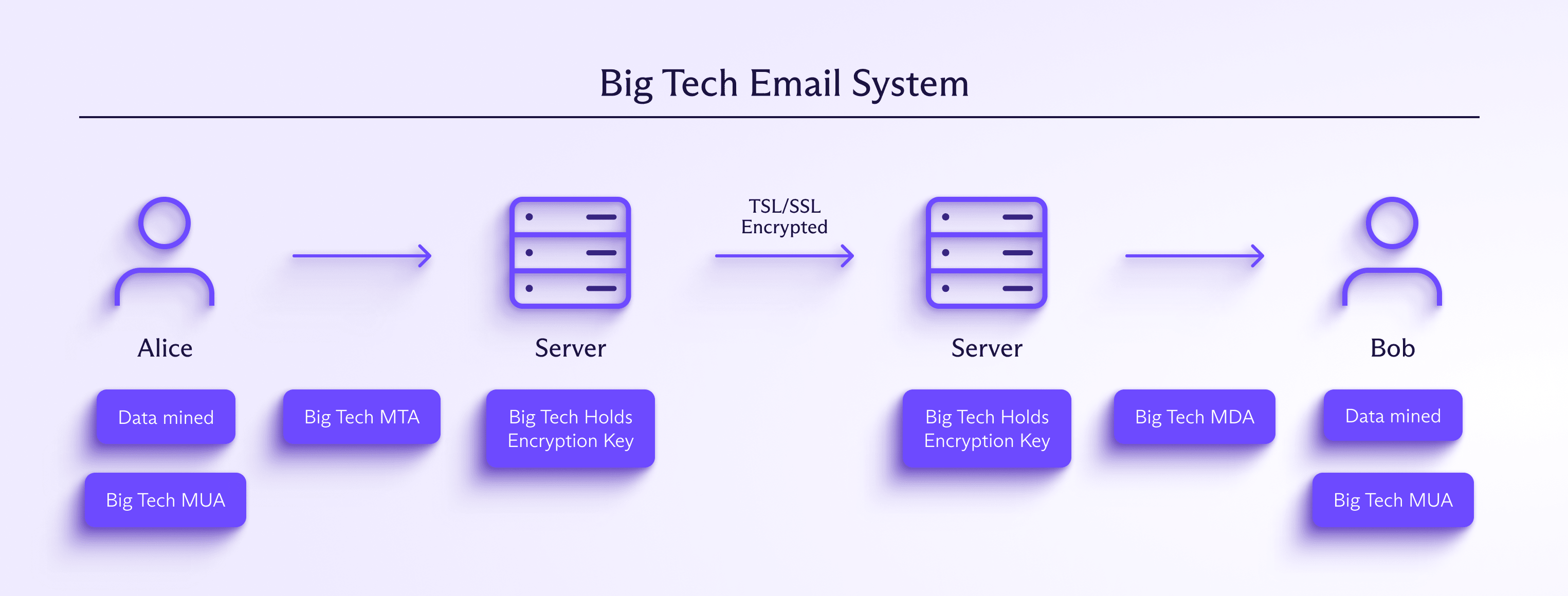 Ci-dessous se trouvent trois diagrammes illustrant la manière dont les données sont traitées dans différents systèmes de messagerie. Le premier montre comment les géants de la tech accèdent facilement à vos données. Le deuxième montre la mise en œuvre de Proton Mail, qui chiffre les messages localement avant de les envoyer au serveur. Et le troisième dépeint une configuration typique de serveur de messagerie privé, qui préserve la vie privée au détriment de la sécurité car les e-mails ne sont pas chiffrés de bout en bout par défaut.