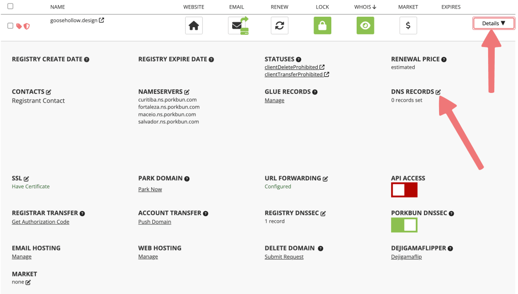 Note: The steps below apply only if your domain’s nameservers are set to Porkbun DNS. If your nameservers point to another service, add the same DNS records in that provider’s DNS management console instead of the Porkbun dashboard.