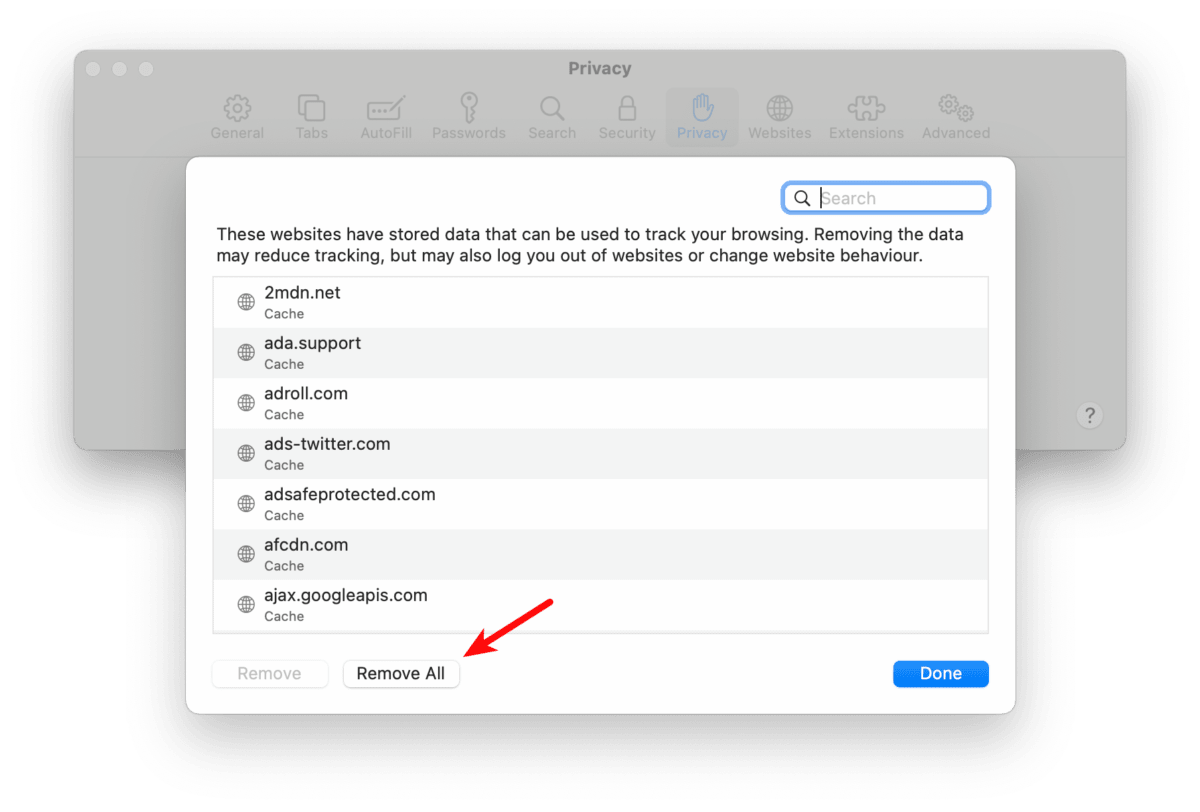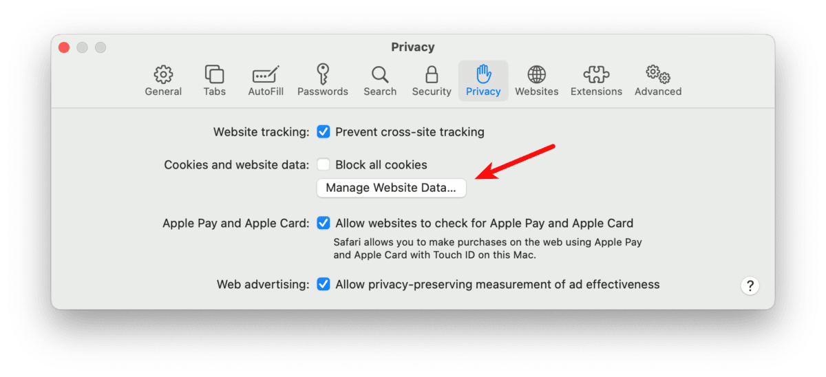 1. Go to Safari in the macOS menu bar → Preferences → Privacy tab and click Manage Website Data…
