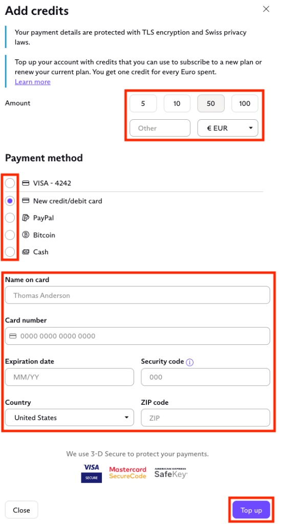 4. Enter your payment details and click Top up when you’re done.