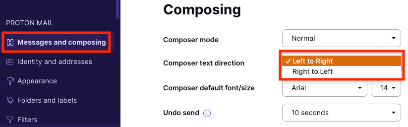 You can also set a default composer text direction in your Proton Mail account.