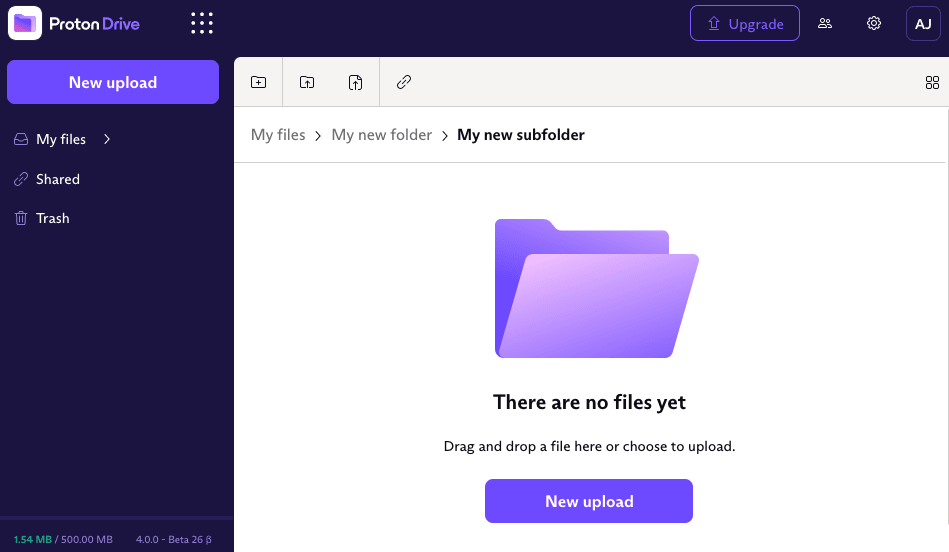 You can create folders and subfolders to better organize and categorize your newly-encrypted files. Folders you create in Proton Drive are also encrypted using the same method of PGP encryption that we use for your files.