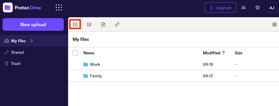 Creating a new folder in Proton Drive