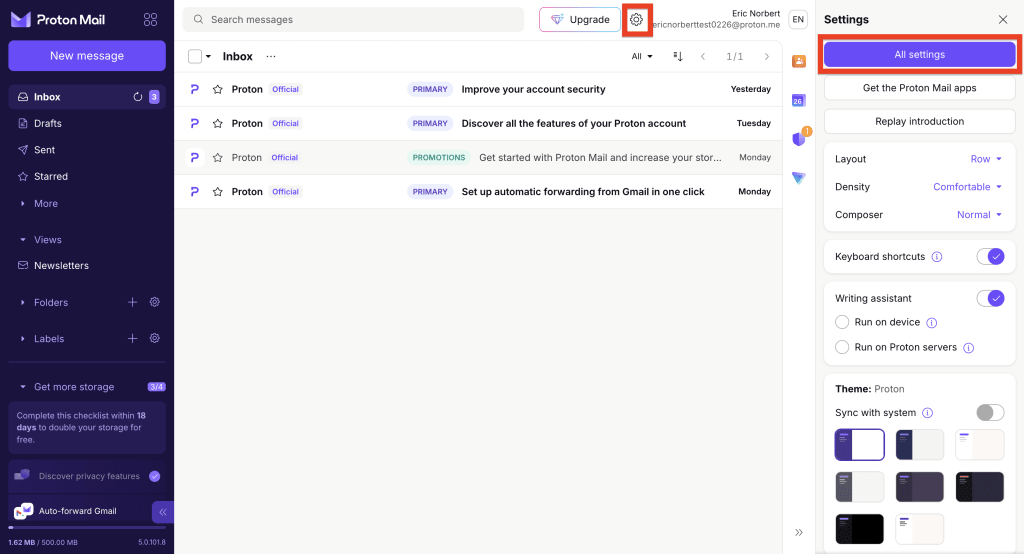 - Sign in to account.proton.me. Go to Settings ⚙️ → All settings.