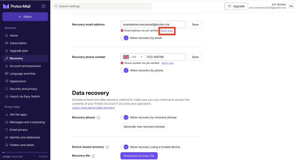 These recovery methods won’t restore your account data (like emails, calendars, contacts, files, passwords). To make sure you don’t lose access to your data after a password reset, make sure you have at least one data recovery method enabled, and ideally your recovery phrase too.