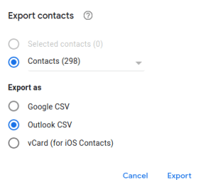 Go to Google Contacts(new window) → Export (in the left sidebar). Ensure Export as… Outlook CSV is selected, and click Export.