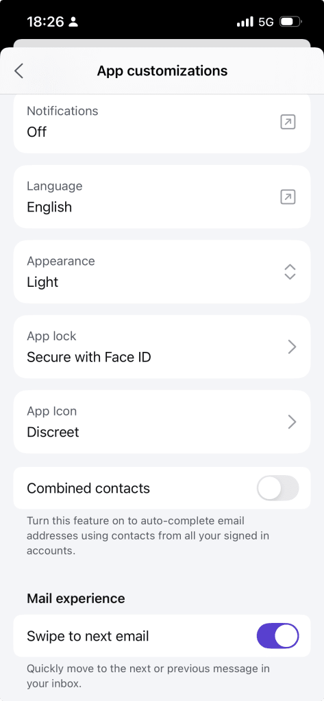 - Open the Proton Mail app. Tap Settings, then select App customizations.