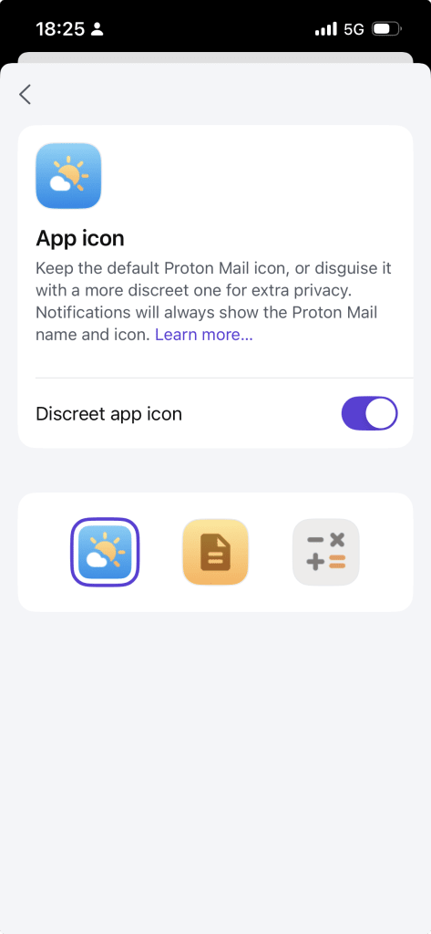 Proton Mail mobile apps allow you to replace our standard app icon with something more discreet. Disguising your app icon makes it less obvious that you’re using Proton Mail if someone looks at your home screen. Notifications will still show the Proton Mail name and icon.