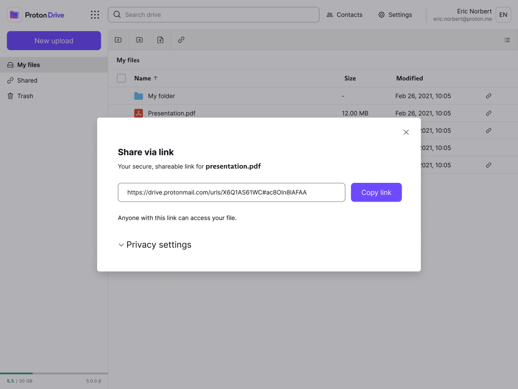 Learn how to create a shareable link in Proton Drive.