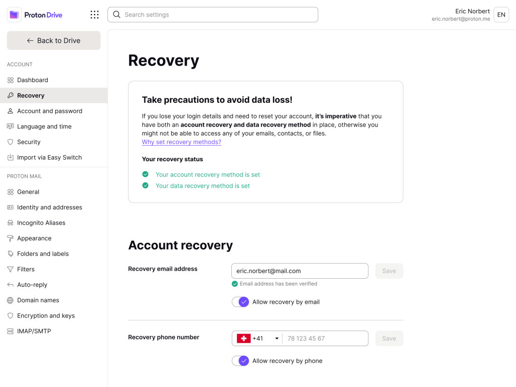 Setting a recovery method enhances the security of your account and allows you to recover all your data and files in case you need to reset your password.