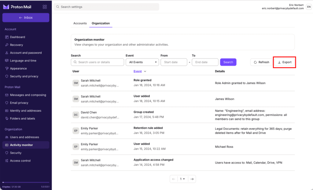 Organization monitor shows actions that administrators have taken within your Proton organization. It helps admins see what changes were made, who made them, and when.