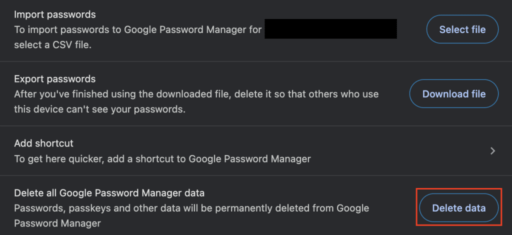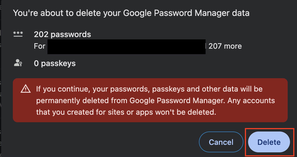 6. Confirm that you want to remove all of your data from Google Password Manager by selecting Delete.