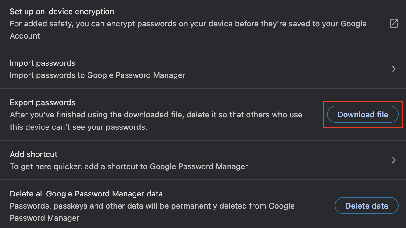 - Go to Export passwords and select Download file.