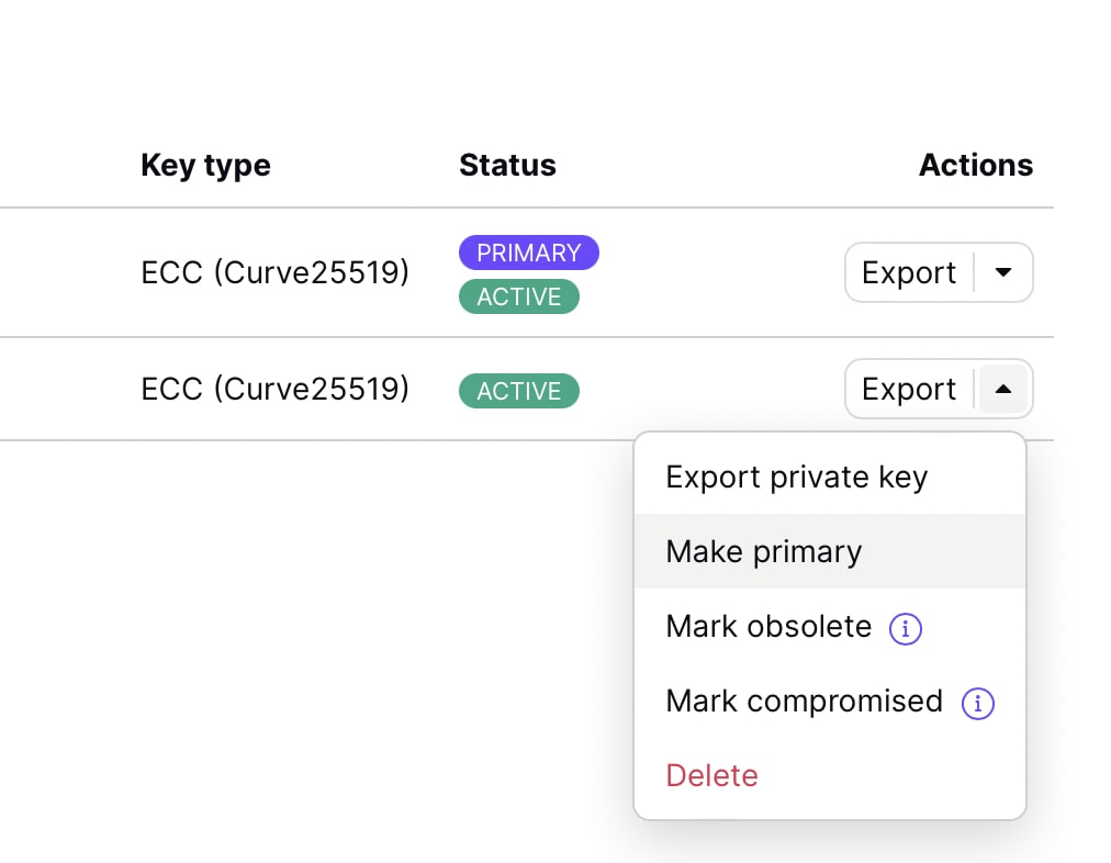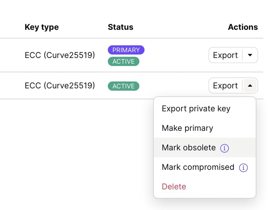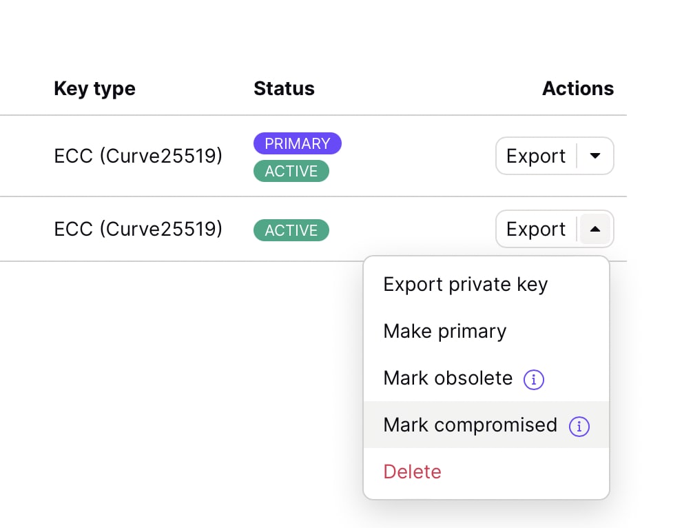 You can mark your key as compromised by going into the key dropdown and clicking on Mark compromised. You can only mark a non-primary key as compromised. A compromised key is always seen as obsolete. You can mark a compromised key as non-compromised by opening the key dropdown menu and selecting Mark not compromised.