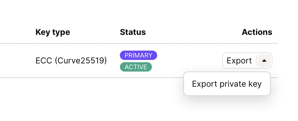 To export the private key of a certain address or contact, click on the down arrow under the Actions column and select Export private key. Because your private keys can be used to decrypt your emails, it is very important that your private keys are not leaked and that you do not import keys that somebody else has access to.