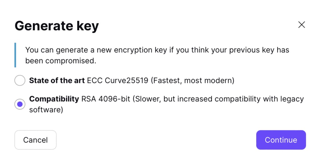By default, Proton Mail will generate a set of keys when you create your account and anytime you create a new email address. When generating the key, you can choose between two different types of keys: