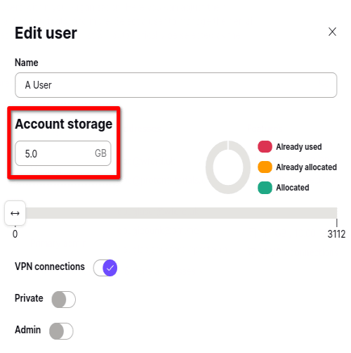You can, however, reassign unallocated storage space. If you delete a user, the remaining storage isn’t automatically reallocated to the other users. If you wish to reallocate it, you can manually assign storage to specific users or administrators: