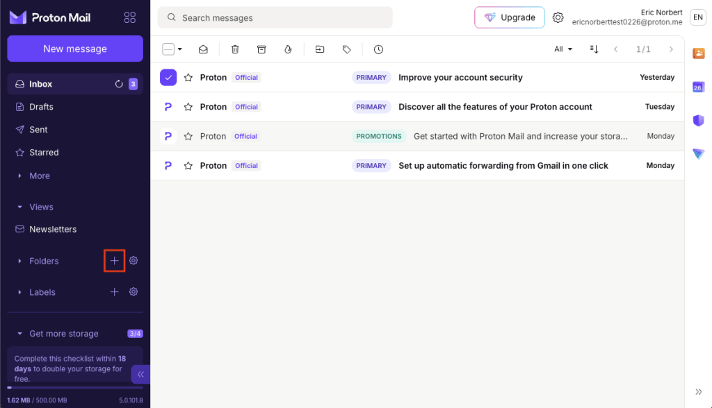 Besides the eight default folders, you can create your own custom folders and subfolders. This can be done from the sidebar in the Proton Mail web app. Simply click the + icon next to the Foldersheading.